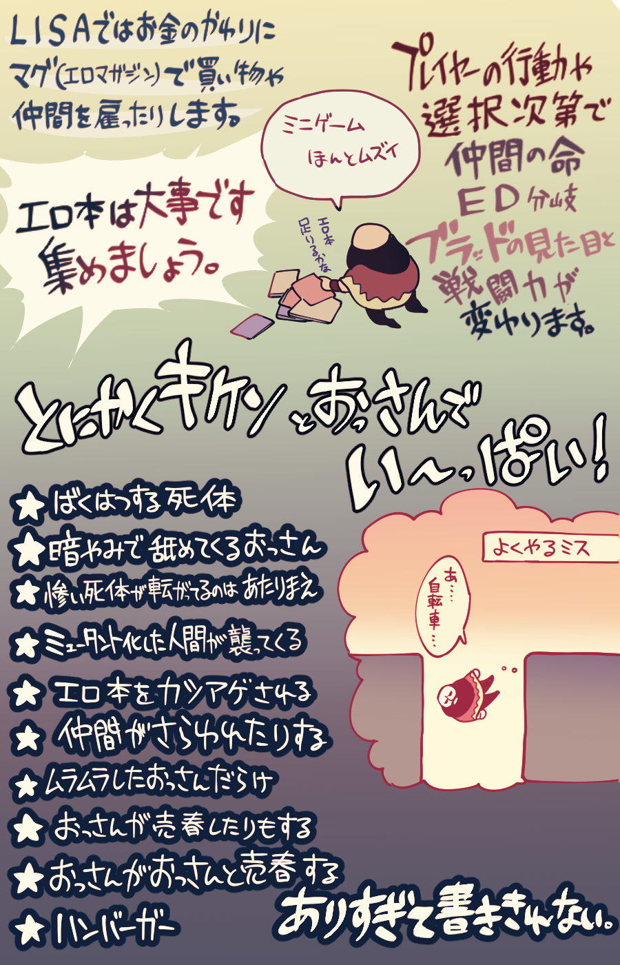 ンォヒーッ ノラサメくんさんのツイート Lisa The Painful というゲームの紹介を描きました おおまかに描いたので詳しいお話やおっさん達は是非本編で 主人公ブラッドの愛と凶暴さとその他愉快なおっさん達を堪能してほしい